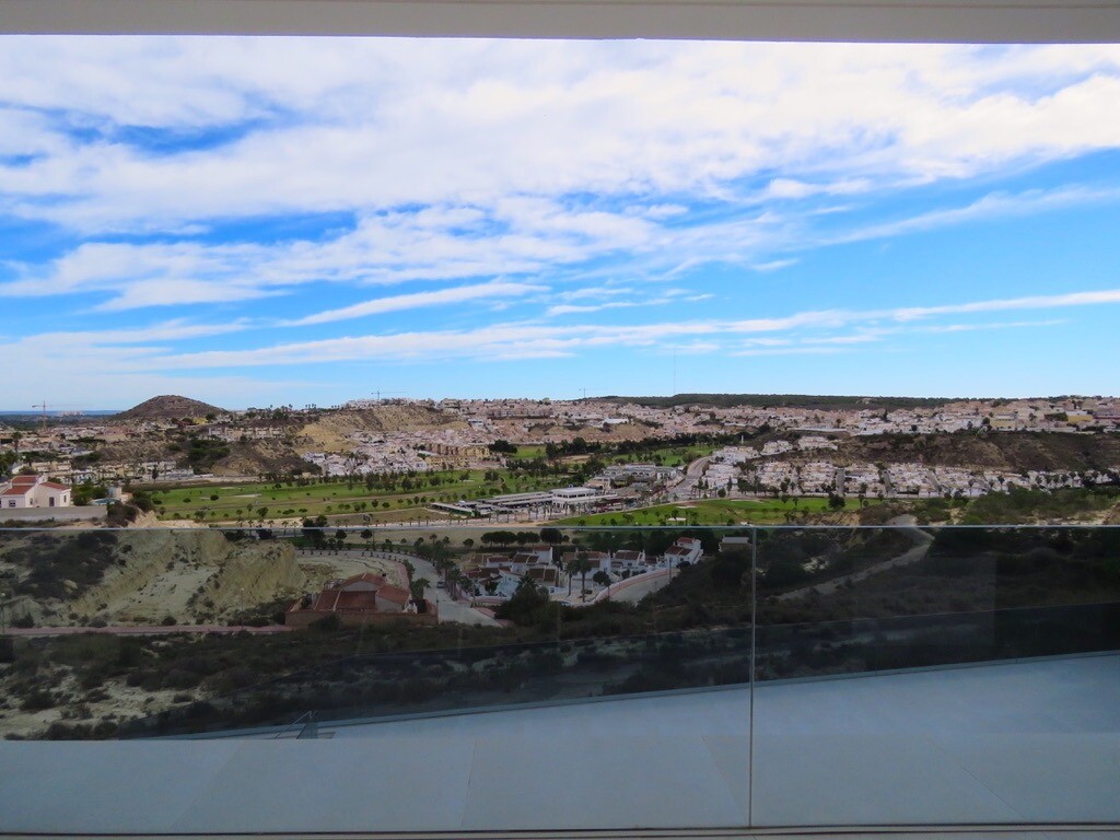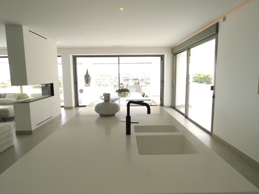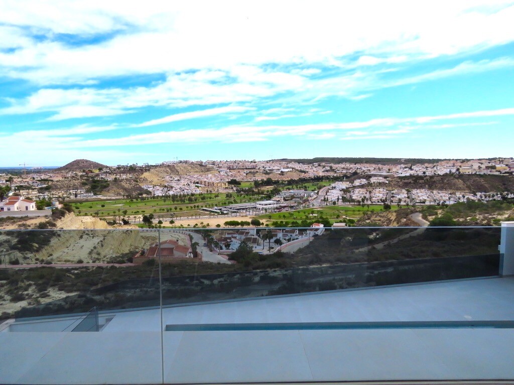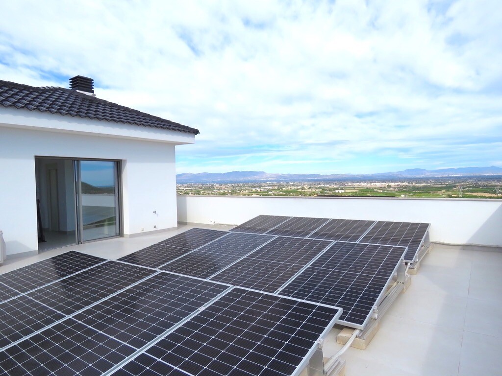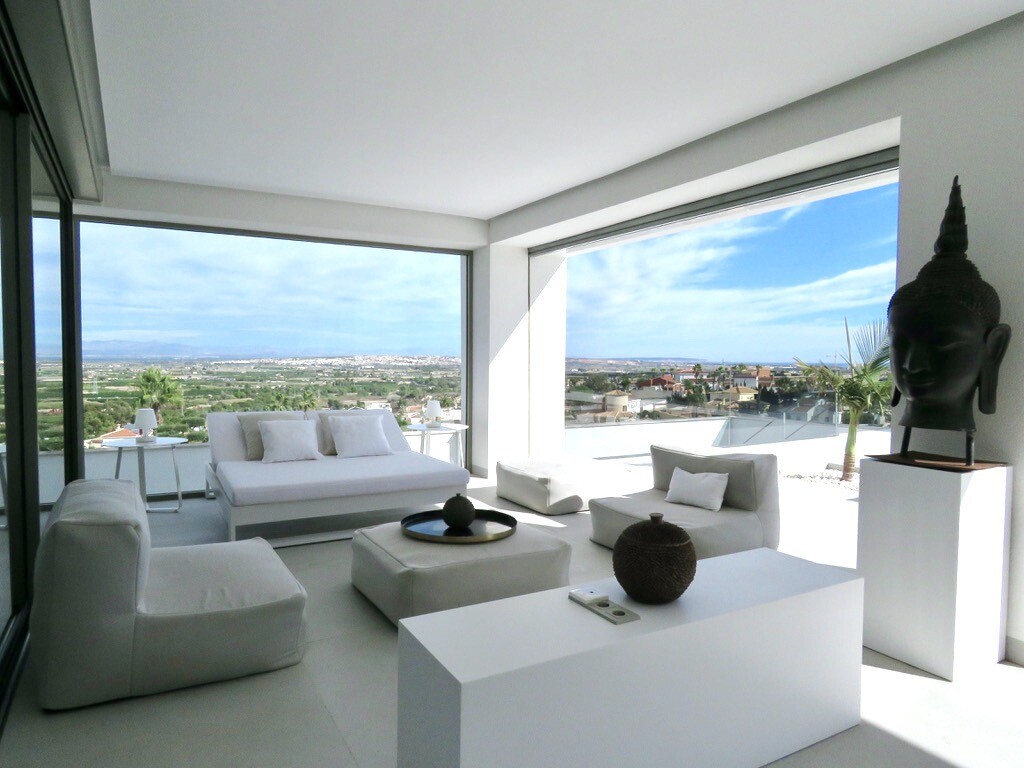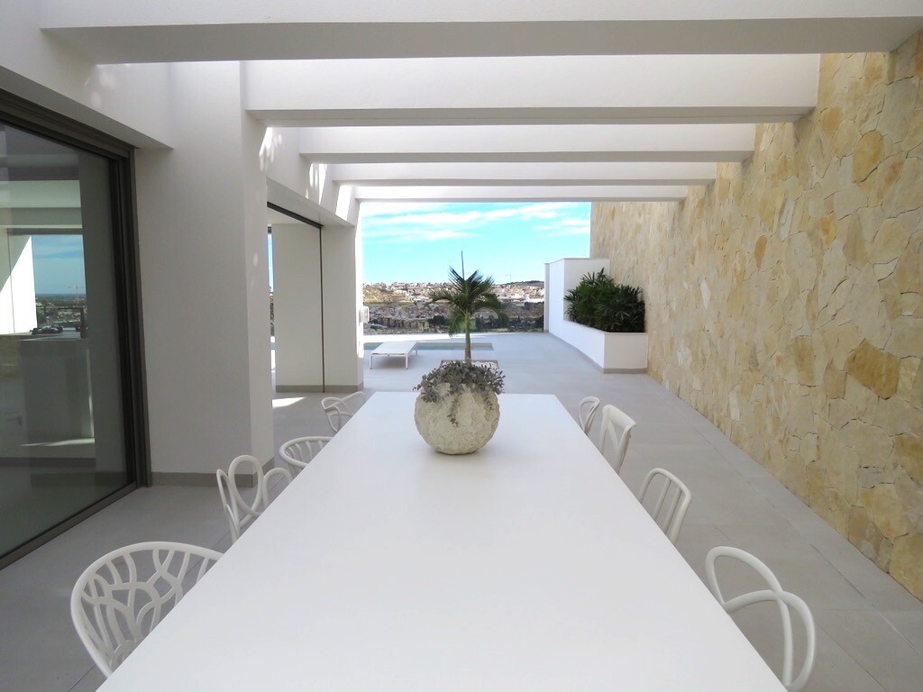 Solarium på 66m2. Denna designvilla är utrustad med den senaste tekniken och alla material är noggrant utvalda. På bottenvåningen finns vardagsrum och matsal med kök, grovkök och även den täckta terrassen. På första våningen har vi 3 sovrum och 3 badrum. På garageplan finns förstås garaget med plats för 8 bilar, ett nöjesrum och det 4:e sovrummet o...ch badrummet. Alla våningar i huset har golvvärme och huset är också helt luftkonditionerat. Hissen tar dig från garaget till husets översta våning. Denna vackra villa är även utrustad med solpaneler. Denna villa har en pool 12x2m, en utomhusdusch med toalett och handfat. Det kommersiella centrumet med La Marquesa Golfs klubbhus ligger bara 900 meter från denna villa. Alicantes flygplats kan nås på 30 minuter.