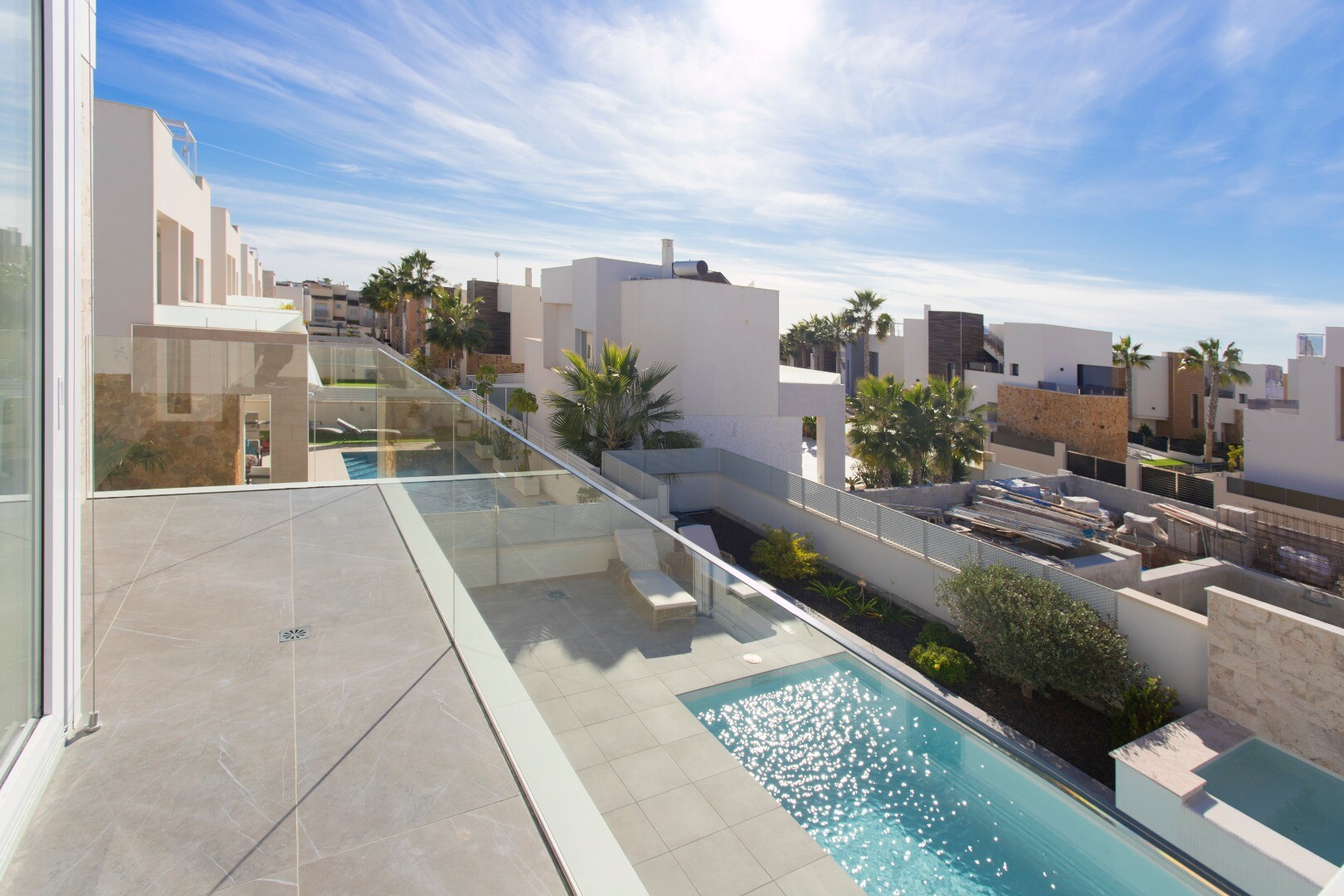 2 villor belägna i Aguas Nuevas-området (Torrevieja) 150 kvadratmeter fördelat på 3 sovrum, 2 badrum och ett stort vardagsrum / kök. Tomterna är 300 kvadratmeter. Öppen utsikt mot poolen med inbyggd jacuzzi och vattenfall från vardagsrummet. Ett stort solarium med grill på takterrassen.